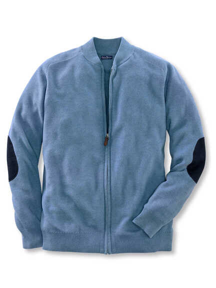 Der Zip-Cardigan sorgt mit Strukturstrick und dunkelblauen Ellbogenpatches für entspannten Motorsportclub-Charme. Eine ultraleichte Pima-Hose bleibt flexibel und sommerleicht, das Hemd liefert die britische Linie in Bleu, Weiß und Beige, und eine Leinen-Cap setzt den smarten Abschluss.