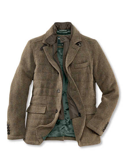 Dieses Fieldjacket ist wie gemacht für Tontaubenschießen vor dem Five o’Clock Tea: Fischgrat-Tweed, Westeneinsatz und smaragdgrünes Entenfutter inklusive. Das Hemd mit Ellenbogen-Patches wirkt wie vom letzten Birdwatching-Ausflug entführt, die Krawatte mit Fasanenprint rundet das Revier ab. Dazu passt die lässige Jeans, die zwischen Jagdhütte und Stadtflair nie fehl am Platz ist.