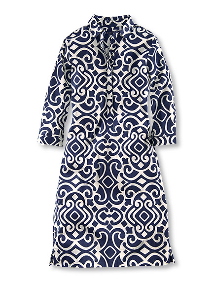 Ein Muster wie aus einem antiken Fliesenladen von den Hebriden: ornamental, verschlungen, zeitlos. Mit den dunkelblauen Ballerinas bleibt der Look ruhig, während die rote Tasche alles in Richtung Hafen, Bojen und Leuchtturm rückt. Perfekt für einen Sommer, der nach Abenteuer am Meer schmeckt.