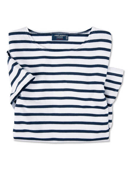 Raw Denim trifft Ringel – ein Klassiker-Duo, das einfach immer funktioniert. Die Barbour-Jeansjacke lässig über das Saint-James-Streifenshirt, dazu eine extraweite Leinenhose und sportliche Sneaker in Creme. Irgendwo zwischen der Côte d'Azur und dem Hamburger Hafen – ganz ohne Kofferpacken.