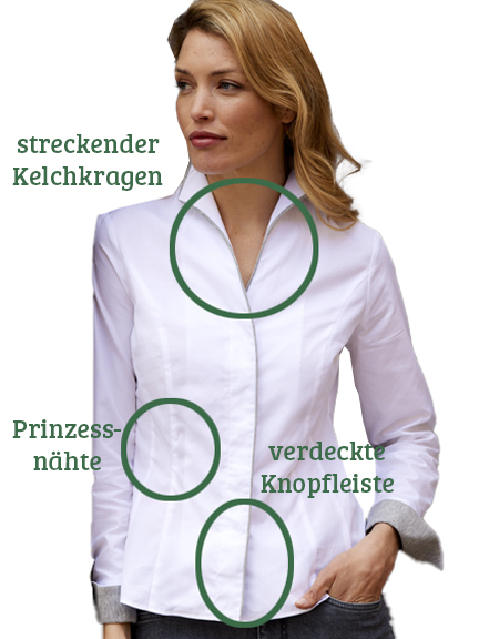 Bietet die Bluse genügend Weite für eine große Oberweite, aber keine formgebenden Elemente wie Abnäher oder Teilungsnähte, fällt der Stoff vom vollsten Punkt der Brust gerade nach unten. Er verdeckt die Taille und erzeugt eine kastige Silhouette. Fließende Stoffe wie Baumwolljersey oder Batist beugen dem vor. Vermeiden Sie grobe Cordblusen und festen Popeline. Taillenabnäher und Prinzess- oder Wiener Nähte betonen die Taille und wirken formgebend. V-Ausschnitte wie der Kelchkragen schaffen eine streckende, vertikale Linie.