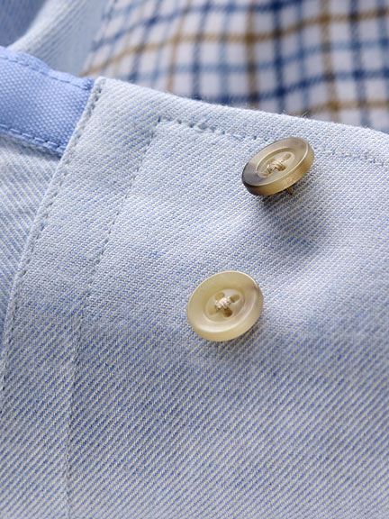 Bei gemusterten Hemden achten Marken wie Charles Robertson und Herringbone darauf, dass Karo- und Streifenmuster an den Nahtstellen, insbesondere am Übergang von Schulter zu Ärmel und entlang der Knopfleiste nahtlos ineinander übergehen. Dies erfordert mehr Stoff und Sorgfalt und wird bei günstigeren Hemden oft vernachlässigt. Besondere Melange-Garne erhöhen die Farbbrillanz. Extras wie der Doppelkragen und Kontrastbesätze an Kragen und Manschette verleihen selbst klassisch weißen Hemden britischen Charme.